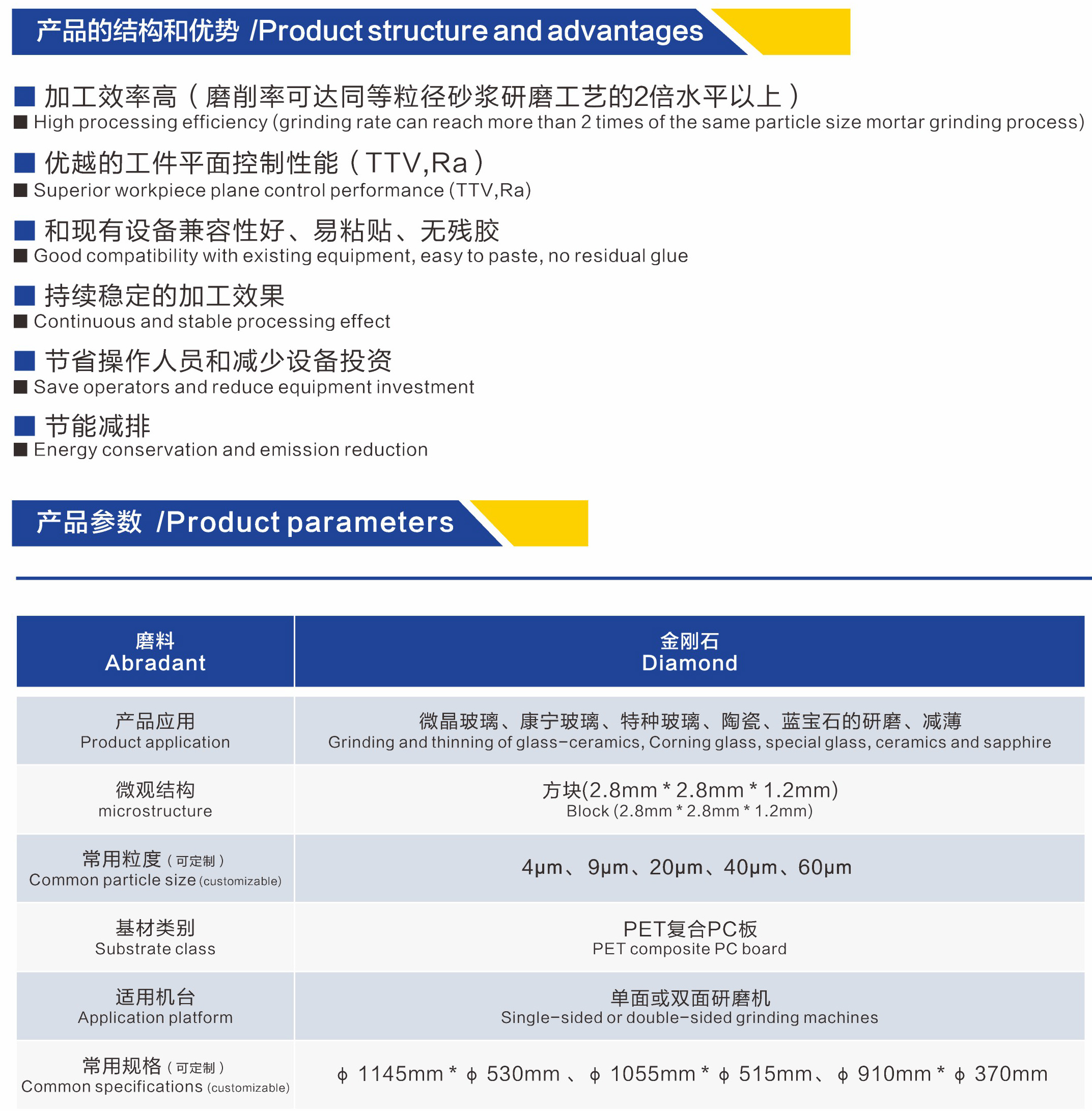 圣高鉆石研磨墊是電子精密研磨的[敏感詞]解決方案,目前普遍使用的5種類型,根據粒徑分為4mic、9mic、20mic、40mic、60mic(可定制),主要應用于微晶玻璃、康寧玻璃、手機玻璃蓋板減薄,攝像頭保護后蓋減薄,光學平面玻璃,藍寶石窗口片,碳化硅半導體片,陶瓷片,以及各種混合產品的冷加工,研磨減薄。